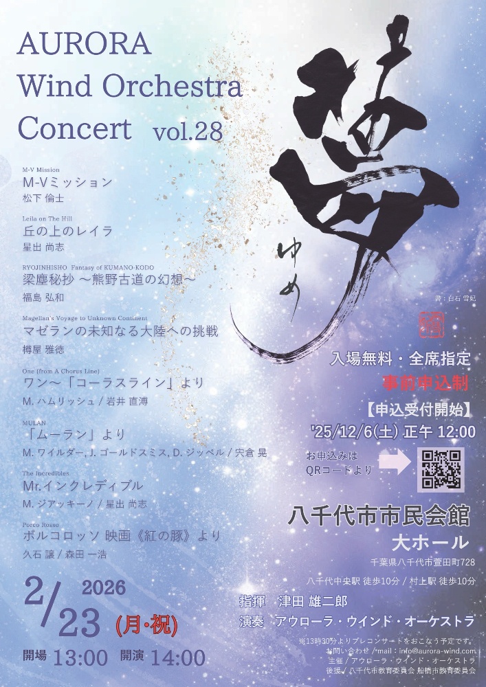 アウローラ・ウインド・オーケストラは、千葉県船橋市を拠点に活動している一般の吹奏楽団です。常任指揮者に津田雄二郎氏を迎え、毎年夏のコンサートと冬の演奏会を中心に様々な活動をしています。コンクールには参加していません。当楽団は、船橋市の社会教育関係団体です。